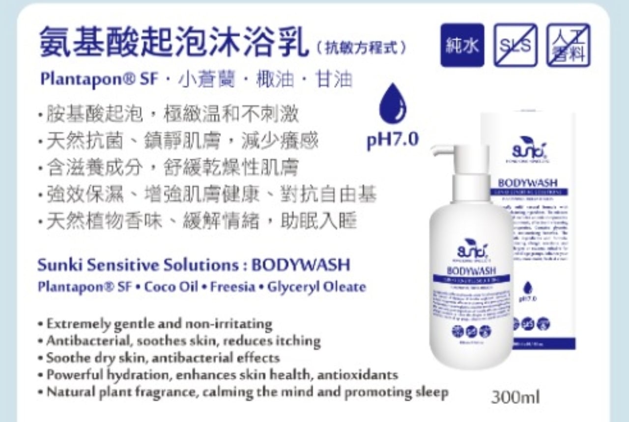 Plantapon® SF 氨基酸系界面,是極緻的起泡成份,配合無患子萃取液的天然皂素,泡沫更進一步的細緻、更溫和地潔淨每一寸肌膚,改善敏感、乾燥等肌膚問題。鎮靜肌膚、緩解痕癢、紅腫、炎症等等之不適,。高效保濕鎖水,維持健康皮膚的潤滑與柔軟。小蒼蘭天然香味,有助舒緩緊張情緒,提升睡眠品質。